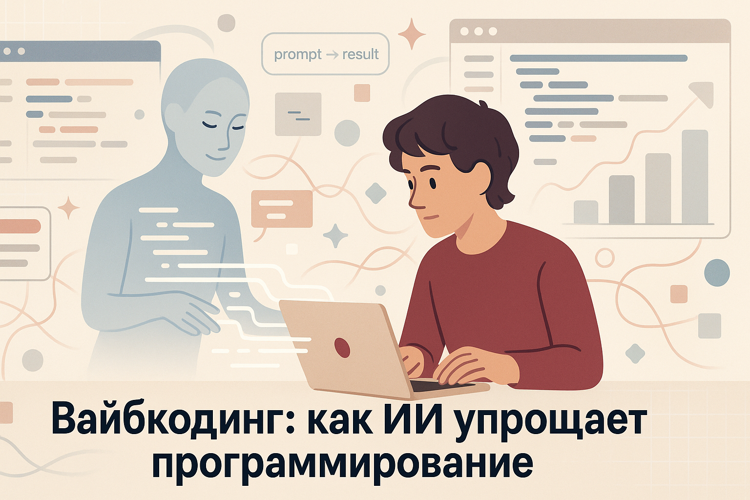 Ответ: Вайбкодинг — это подход, когда разработчик формулирует намерение («вайб») в промпте, а ИИ-ассистент быстро генерирует черновой код, который затем дорабатывается вручную. Это сокращает время на рутину и помогает быстрее валидировать идеи.