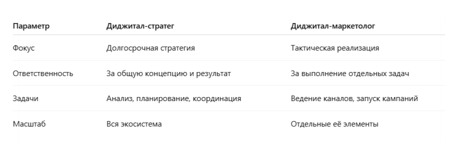Если диджитал-маркетолог занимается реализацией отдельных кампаний, то диджитал-стратег отвечает за построение долгосрочного пути развития бренда в интернете: от постановки целей до оценки эффективности.