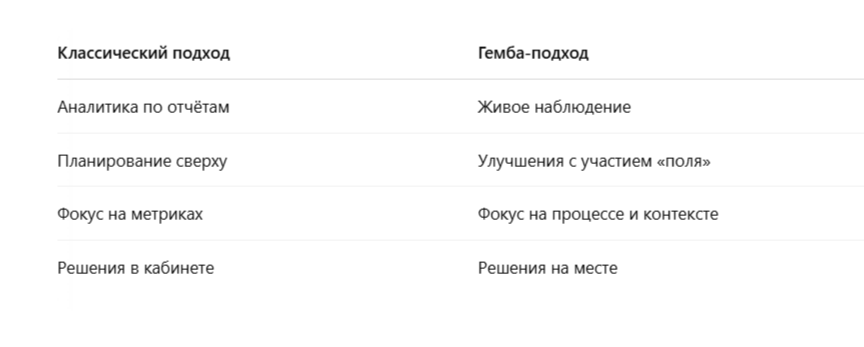 В маркетинге гемба-подход становится особенно ценным там, где важна клиентская логика, путь потребителя и качество обслуживания.